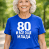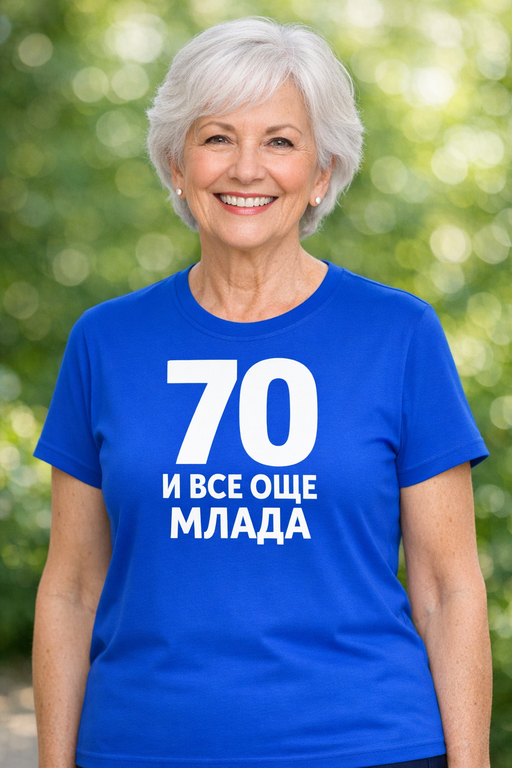Възрастта е просто число, а стилът и настроението са вечни! Надписът „70 И ВСЕ ОЩЕ МЛАДА“ носи самочувствие, хумор и много поводи за комплименти.