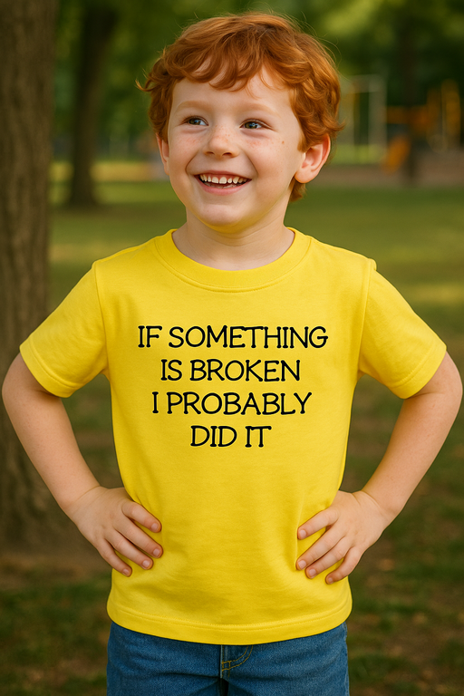 😂 Жълта тениска + честно признание = много смях: IF SOMETHING IS BROKEN I PROBABLY DID IT! За всички малки палавници, които „тестват“ играчки, копчета и търпението на родителите. Когато стане беля, тази тениска поема вината и обезоръжава дори най-сериозните погледи. Яркият цвят привлича вниманието, а надписът казва това, което всички вече знаем: експериментът е успешен (нещо се е пръснало)!
