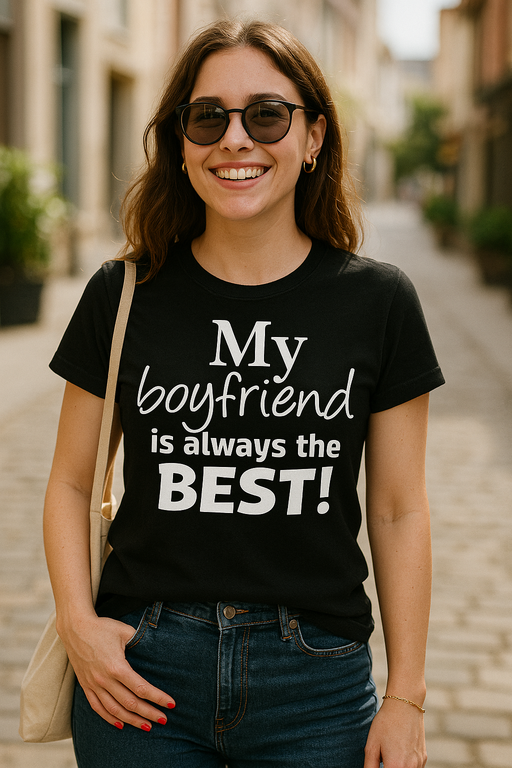 😏 Твоята любов е шумна, а тениската ти още по-шумна: "My boyfriend is always the BEST!" Черната тениска казва всичко без дълги речи – и спасява от неловки комплименти на семейни вечери.