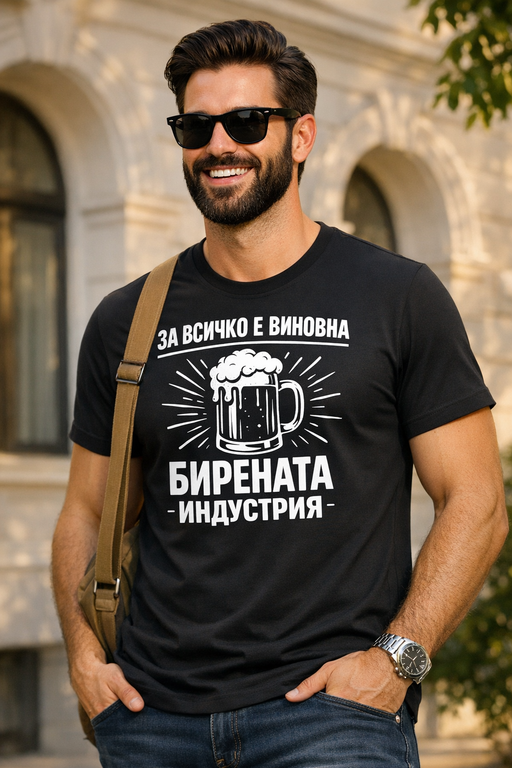 Като нещо излезе извън контрол, виновникът е ясен: бирата. Черна тениска с надпис „ЗА ВСИЧКО Е ВИНОВНА БИРЕНАТА ИНДУСТРИЯ“, която казва всичко вместо теб.
