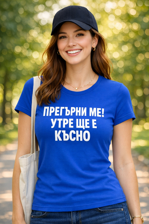 Тази синя тениска казва всичко вместо теб: „ПРЕГЪРНИ МЕ! УТРЕ ЩЕ Е КЪСНО“. Перфектна за смели хора, които не отлагат и обичат да събират усмивки.