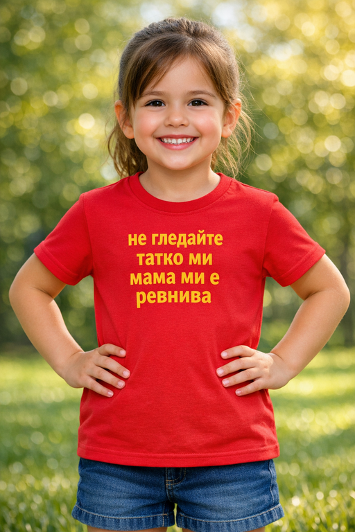 Смешна детска тениска „Не гледайте татко ми, мама ми е ревнива“